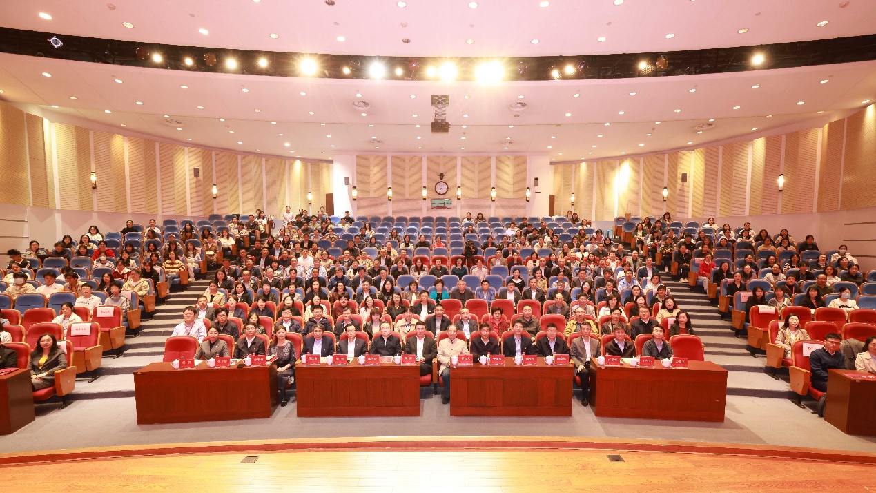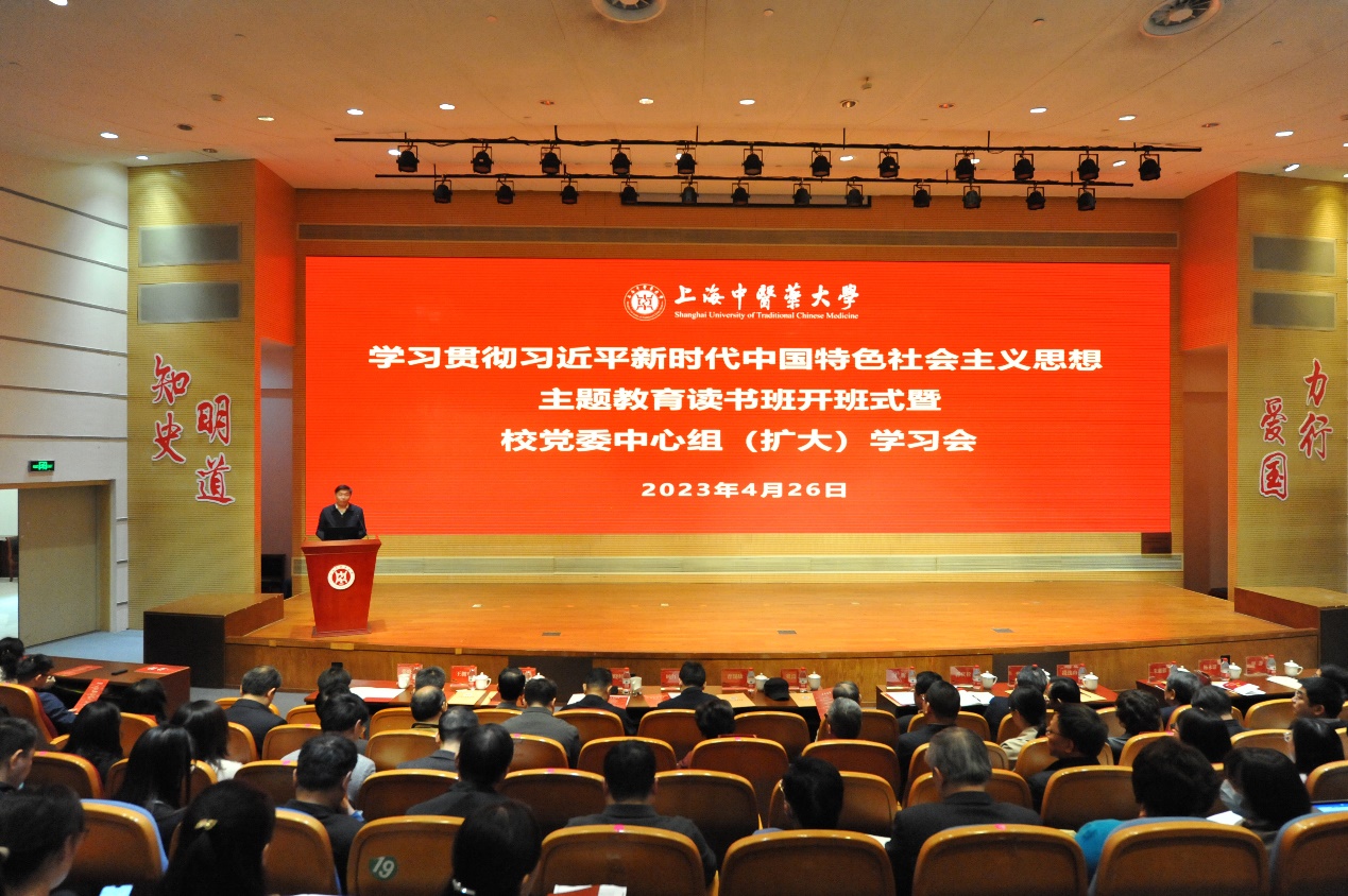 4月26日上午,beat365手机版官方网站学习贯彻习近平新时代中国特色社会主义思想主题教育读书班开班式暨校党委中心组(扩大)学习会在学校图书馆四楼报告厅举行。由beat365手机版官方网站、上海市领导科学学会、上海市马克思主义研究会联合主办的“中华文化和中国精神的时代精华”马克思主义与中华优秀传统文化相结合学术研讨会同期举行。上海市教卫工作党委副书记、市教委副主任闵辉出席会议并致辞。市委第十八巡回指导组专职联络员、市教卫工作党委宣传处副处长张晓飞到会指导。beat365手机版官方网站主题教育领导小组成员,校党委中心组成员,马克思主义学院全体教师,校本部教师党支部书记、青年教师班主任,组织员、辅导员,以及学生党员代表等参加。会议由beat365手机版官方网站党委副书记、副校长朱惠蓉主持。
