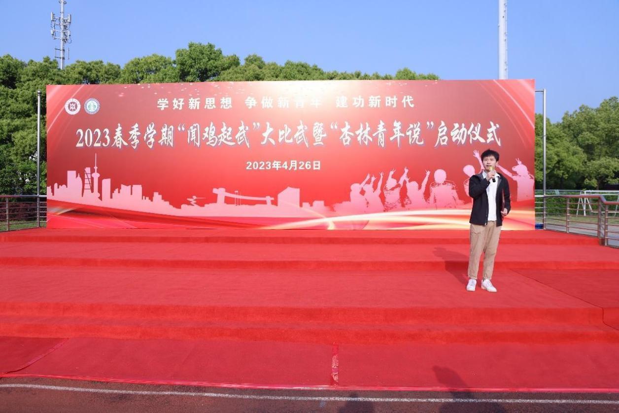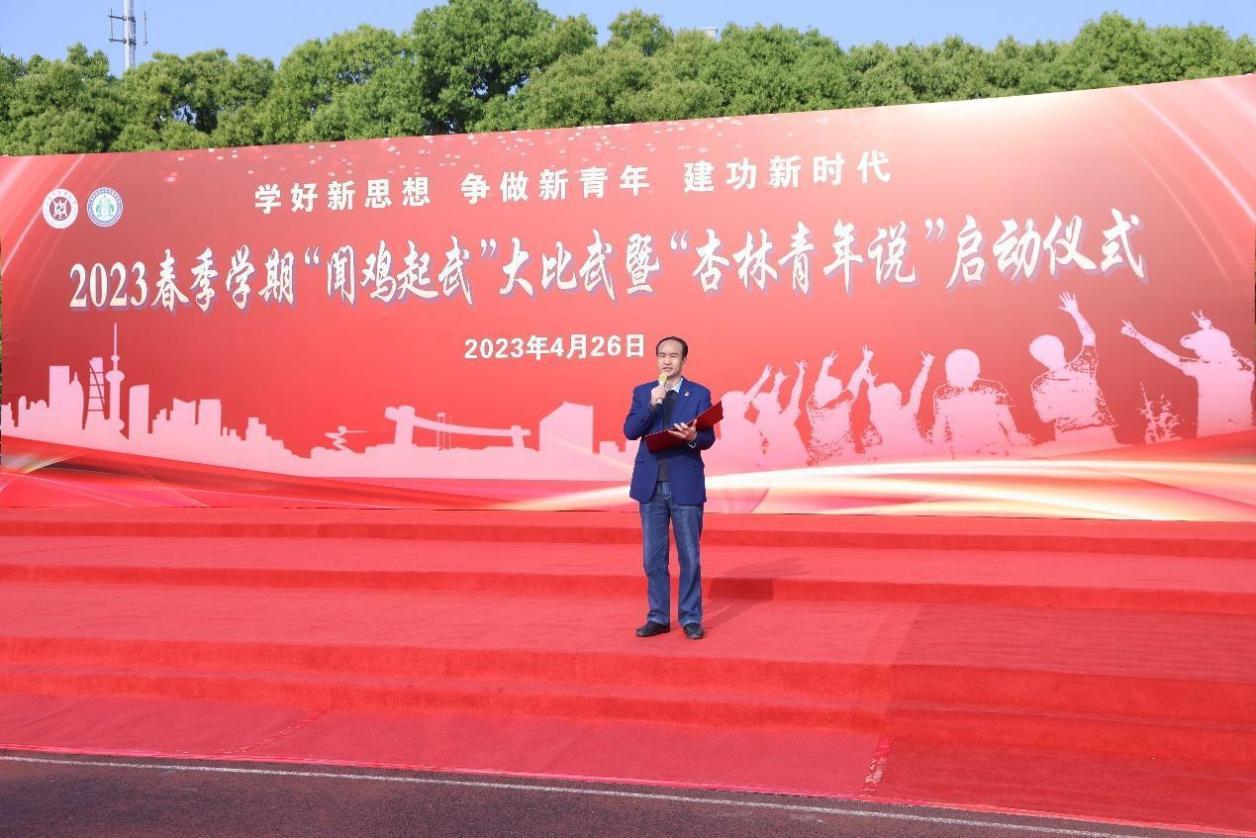 晨起闻鸡鸣,“武”动正青春。4月26日清晨,2023年春季学期“闻鸡起武”大比武暨“杏林青年说”启动仪式在学校体育场举行。基础医学院党委、体育部党支部、党建共建单位的党员代表、基础医学院2022级全体学生等近300名师生参加。活动由2021级中医学(屠呦呦班)常睿发和朱逸菲主持。